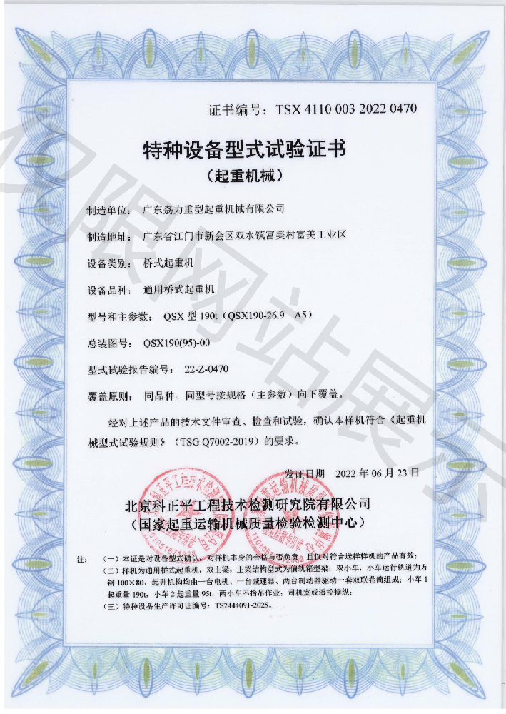 特種設備型式試驗證書--通用橋式起重機